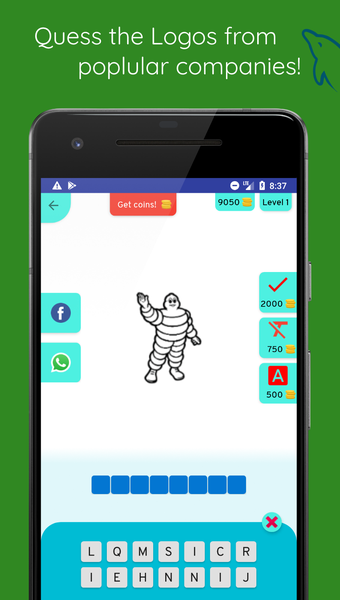 Wanneer je Logo Quiz: Raad Het Logo voor het eerst opent, vind je een gratis logo quiz spel. Het zal je vragen om de letters in de juiste volgorde te zetten om het logo te raden. En als je vastzit op een niveau, kun je de hints en aanwijzingen gebruiken om je te helpen het puzzel op te lossen.